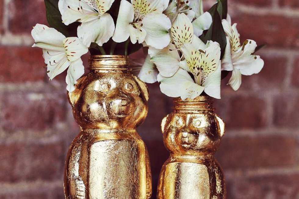 1. Empty + Gold kit 2. Coat bottle with adhesive and allow to dry to sticky feel. 3. Use foam brush to press into grooves. 4. Apply sealer with paintbrush as a top coat.