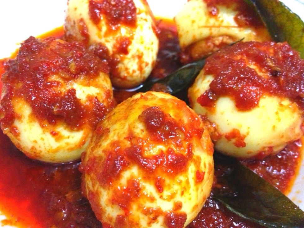 The hot and spicy fried eggs dish or 'telor balado' is originated from West Sumatera, Indonesia. The dish is a common side dish for the celebration yellow rice