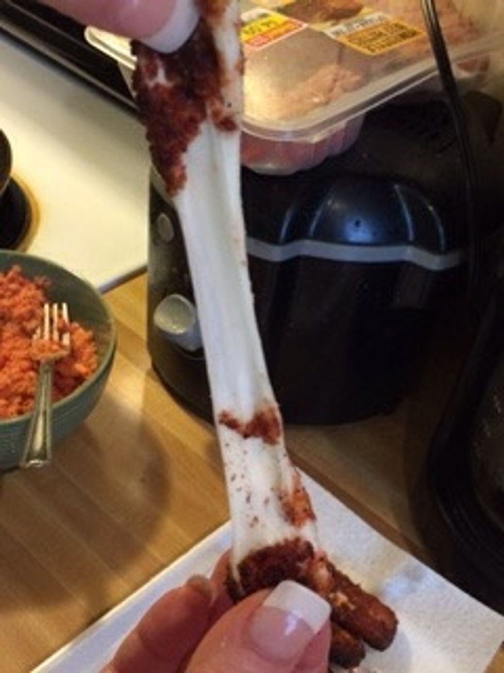 Crush hot Cheetos 1 cup of bread crumbs 1 cup of blended hot Cheetos