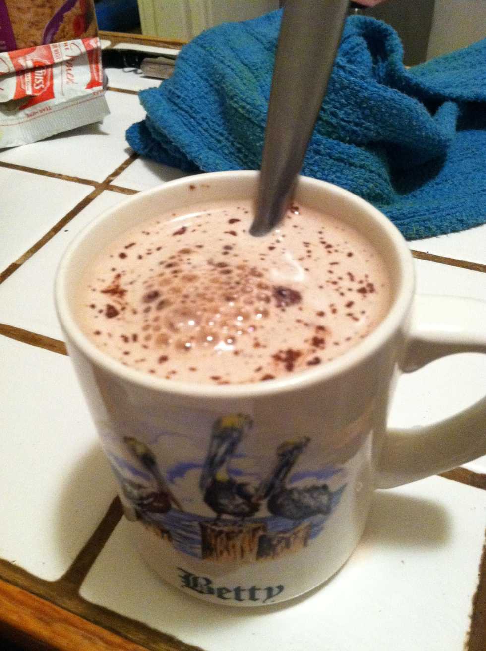 Measure out about as much milk as you want hot chocolate.Heat it up almost to a boil.Pour it back into the mug and add hot chocolate mix.Some chunks are ok.