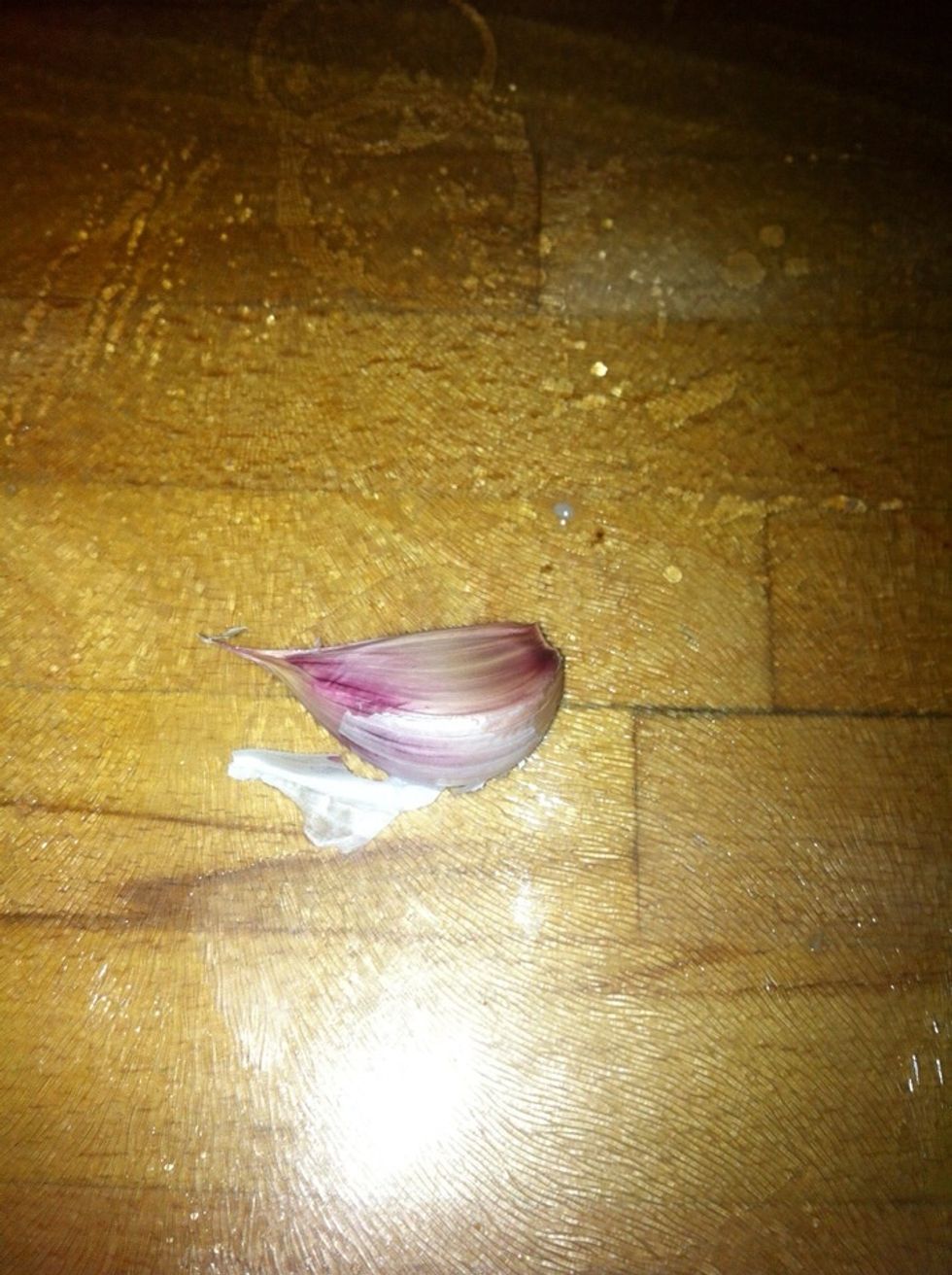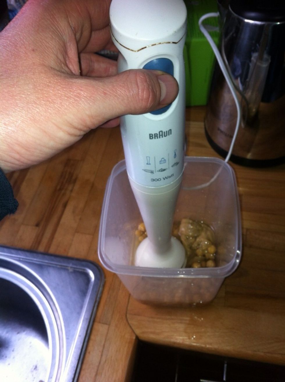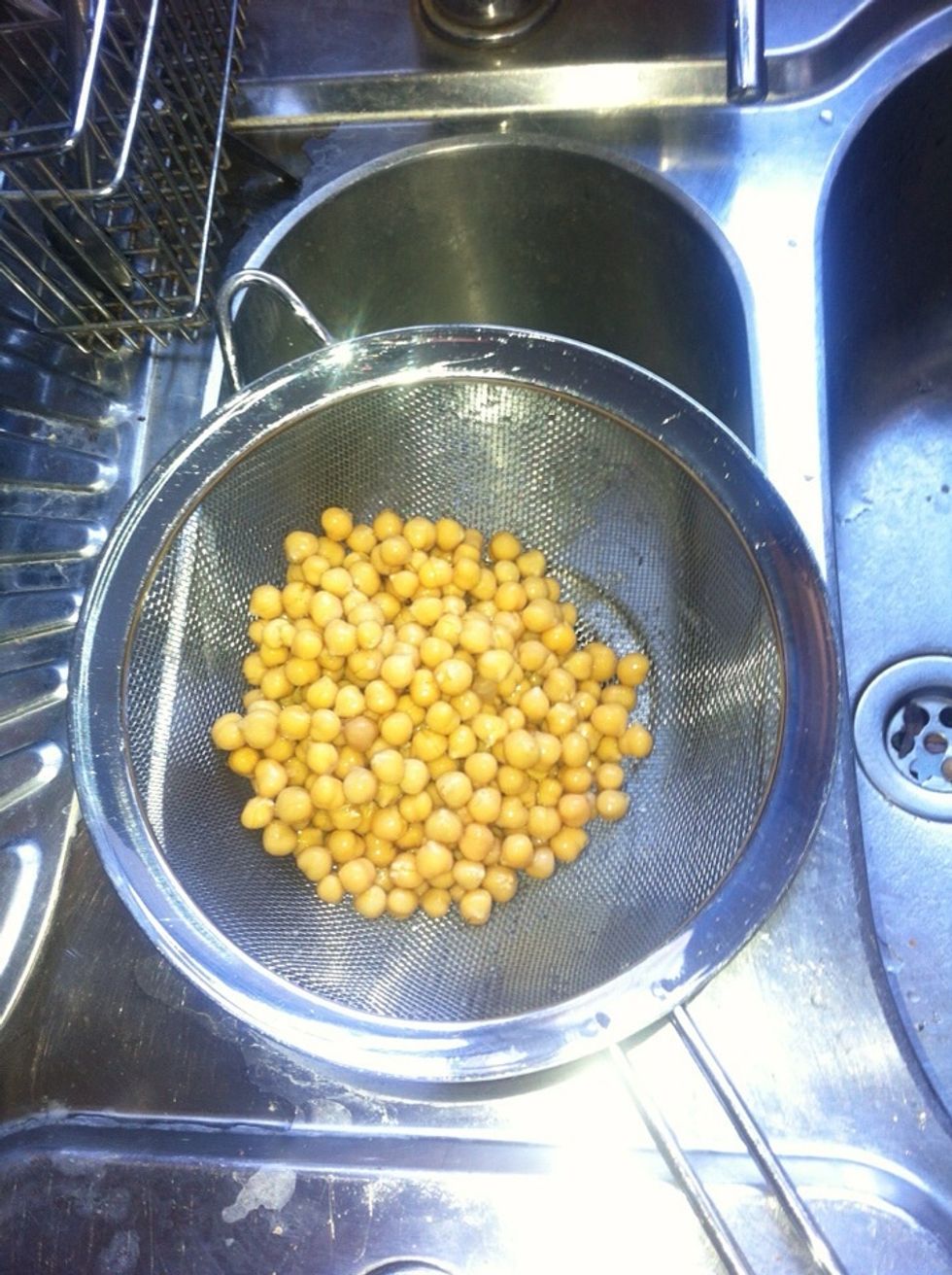 Peal a clove of garlic and add this to the chickpeas. Use less garlic if you don't want your breath to smell:)