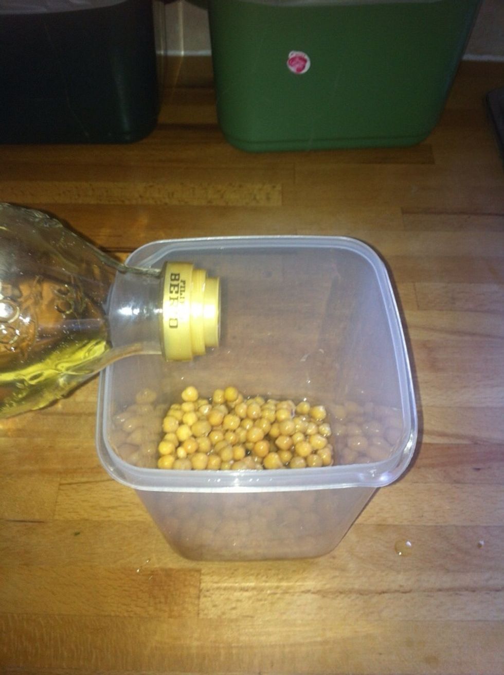Pour 4-5 good lugs of olive oil onto the chickpeas.
