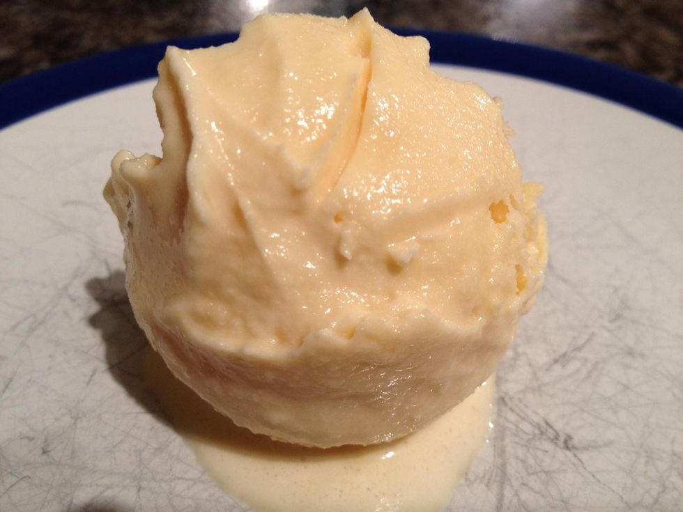 Pour into an ice cream maker and churn for 25-35 mins. Pop in the freezer and it's done! If you churn by hand, stir, pop in the freezer and stir every half hour until it hardens.