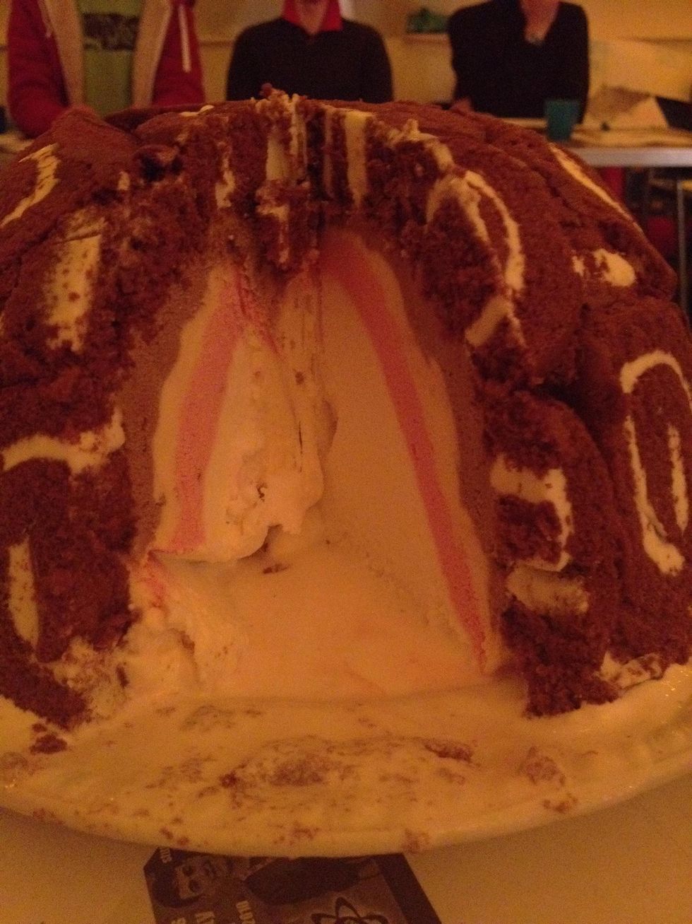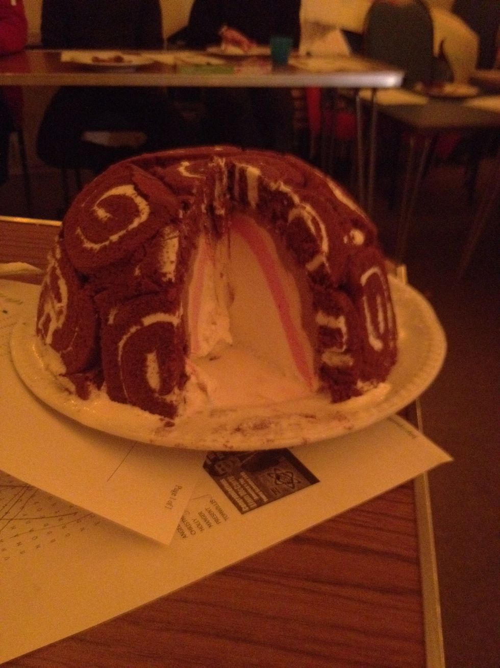 Then start to layer ice cream on top of the swiss roll slices. (I used chocolate first) do this until you have a good inch thick layer of ice cream. Then return to freezer for 1-2 hours