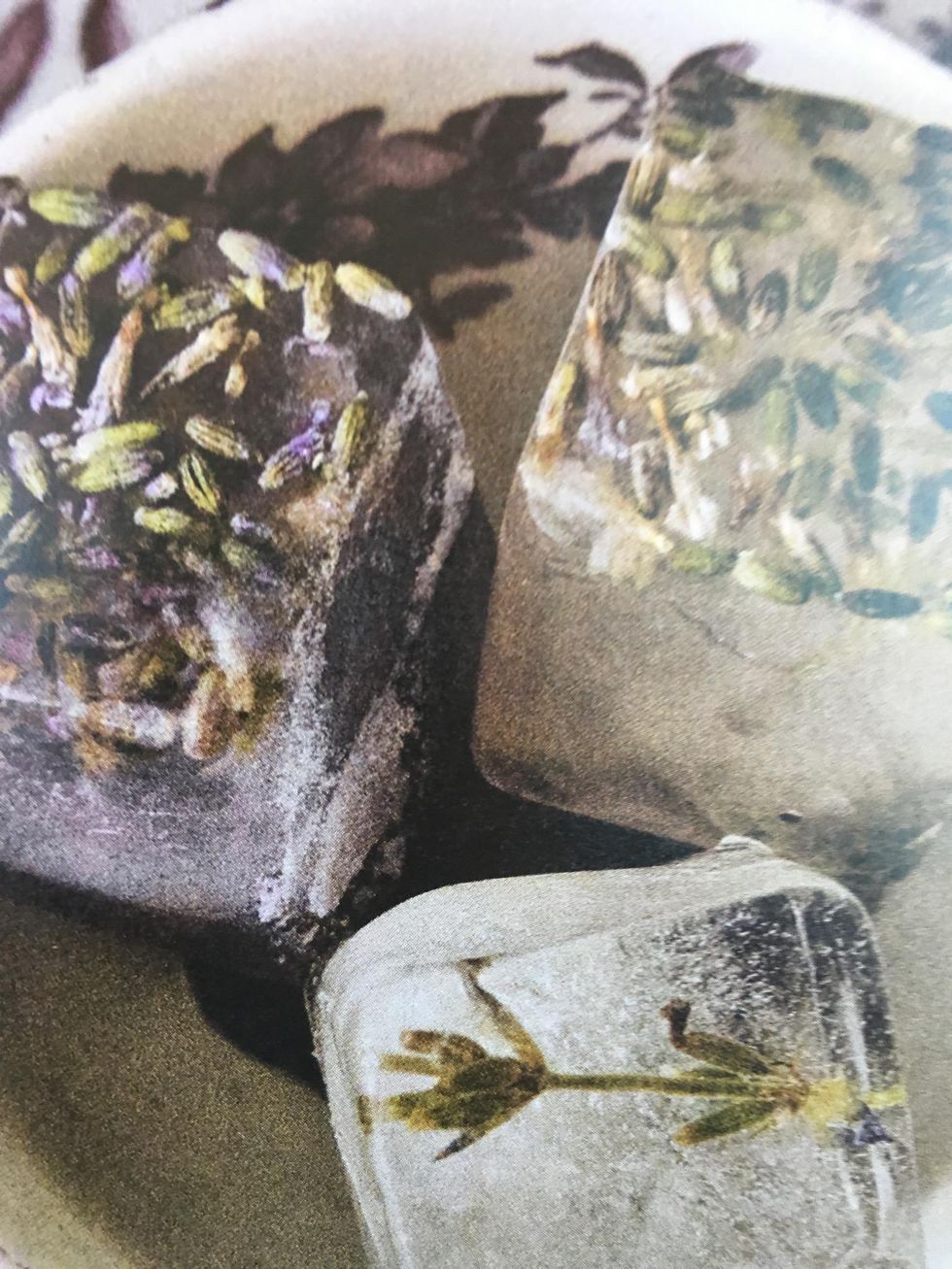 To make gather fresh or dried hibiscus flowers and lavender, tear of the petals, mix with water, add to a ice cube tray, and freeze. Make sure the flowers you are using are pesticide-free!