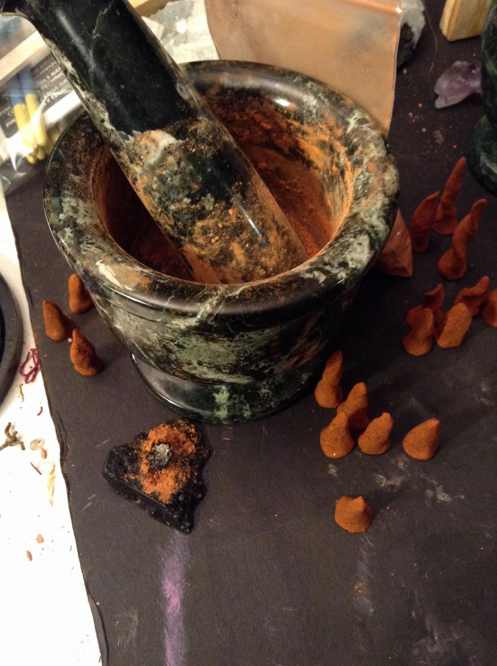 Put 1 tsp frankincense or other resin in mortar, grind to smallness (Mine was mixture of olibanum, dragon's blood resin, and palo santo wood = 1/3rd tsp each). Set powder aside in small bowl or jar.