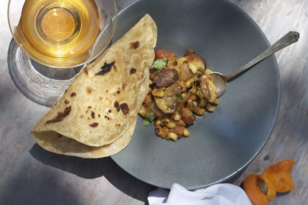 Add in 8 oz of fresh mushrooms and cook them down until they start to soften. Then add 4 chopped peeled tomatoes or 1 can of chopped tomatoes, 2 tsp coriander, 2 tsp cumin ,1/2 teaspoon turmeric .