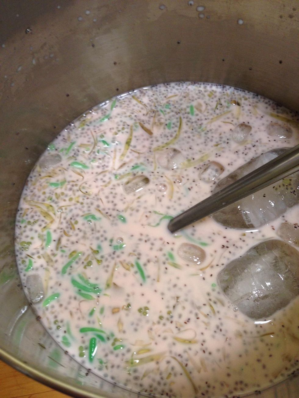 Sweet amber herbal jelly Pandan flavored jelly Rose syrup Milk Ice cream Basil seeds or chia seeds Durian