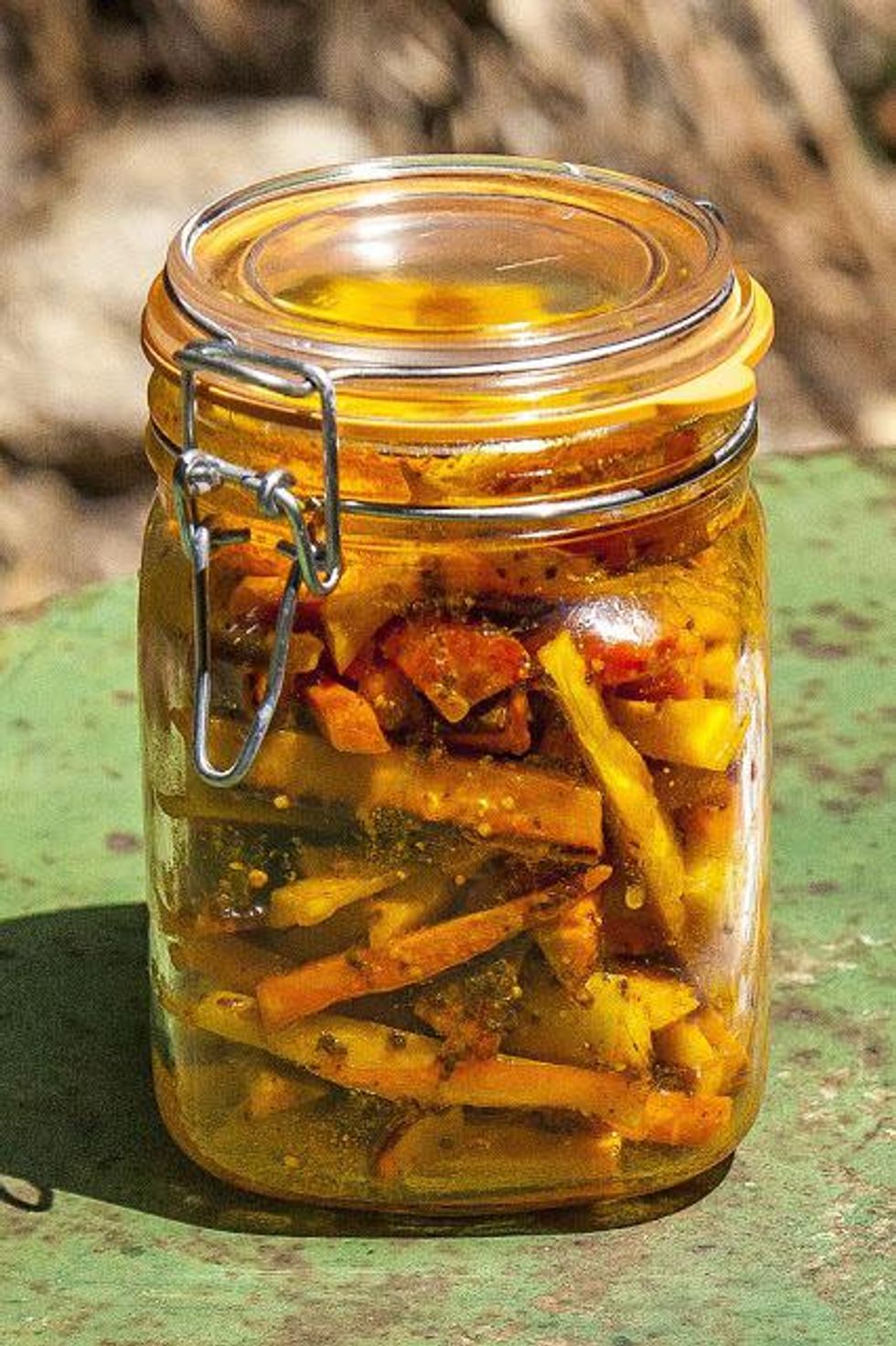 Indian pickles or achars, are made by putting fruit or vegetables in an airtight jar with salt, oil and spices and letting it mellow in the sun. Here's one that can be on the table the very next day