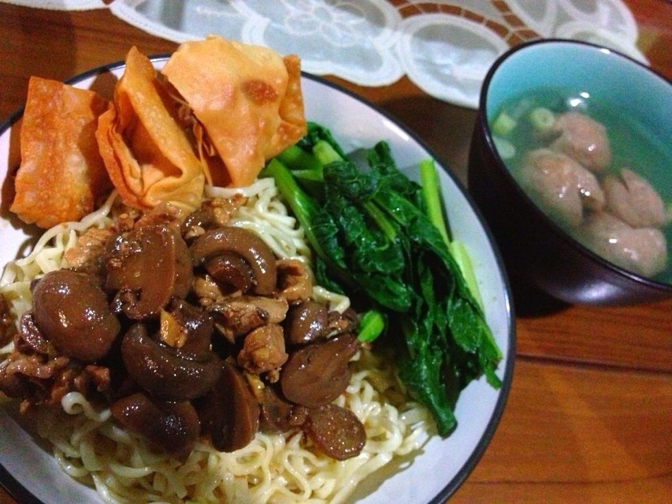 Put some noodles in a bowl, topped with chicken and mushroom. Put some choysim and fried wontons around. In a separate smaller bowl, put some hot stock and the meatballs. Enjoy! :)