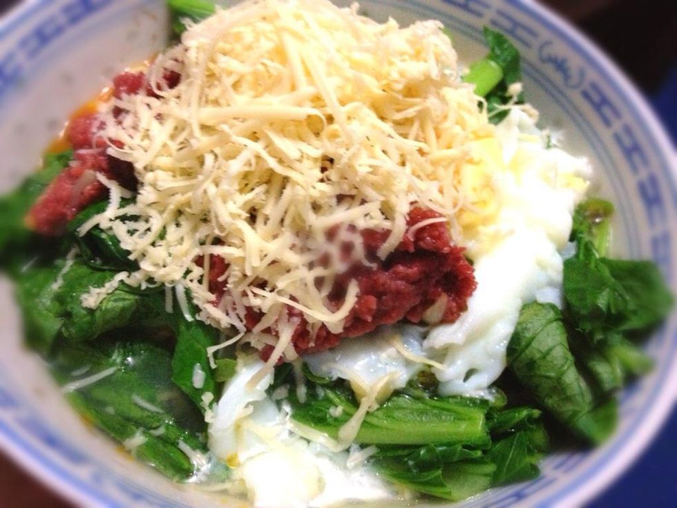 Topped with grated cheddar cheese if you like, or simply topped with fried-shallots. Now who can resists? ☺ enjoy!