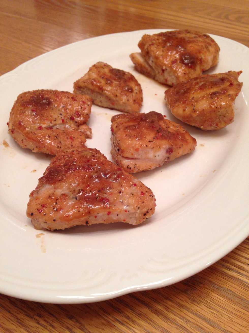 Place in a baking pan covered by foil. Place in oven and cook 15-20 minutes, flipping pieces halfway through.