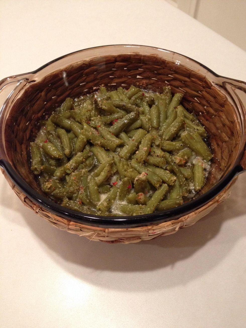 Sprinkle one package of Italian seasoning evenly over the green beans.