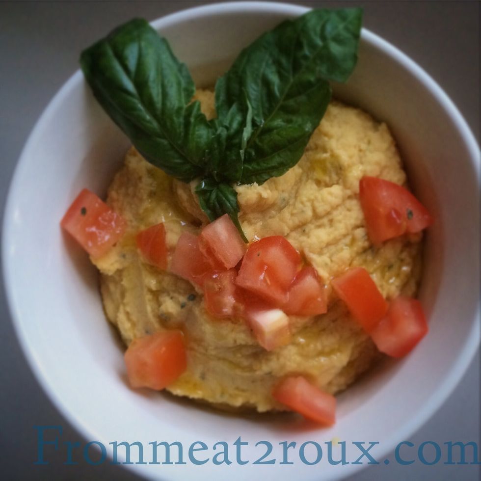 Season with salt and thyme and pulse until mixed thoroughly Scoop into a bowl and top with tomato and basil. For more info/ingredient amounts: http://frommeat2roux.com/2015/04/23/italian-hummus/