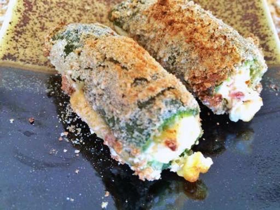 Stuff the peppers and put the halves together. Dip the popper in the egg wash and then coat with the bread crumbs.