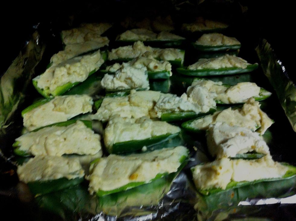 Fill all the boats liberally with your cream cheese stuffing mixture. And place the on a baking sheet. I placed foil over the baking sheet. Preheat your oven to 375F. Place baking sheet into oven.