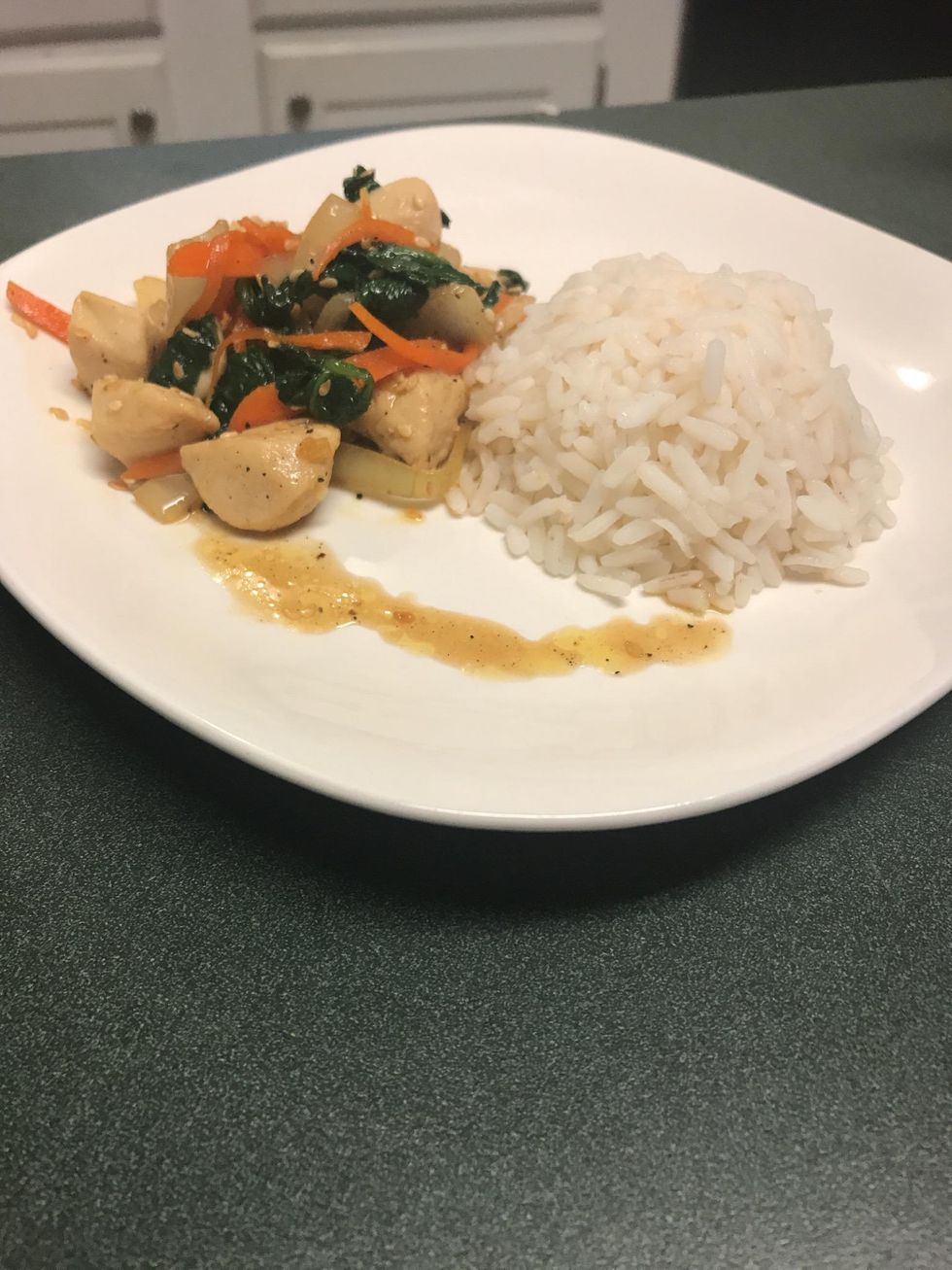 Ingredients - rice - spinach - chicken breast - garlic - carrots - onion - black pepper - salt - sugar - sesame seed oil - sesame seeds - soy sauce