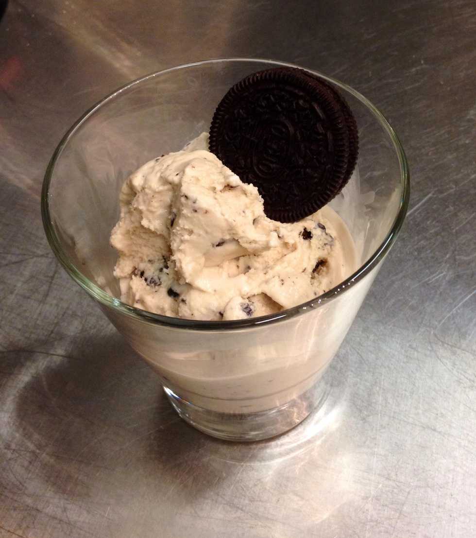 Right as it's nearing completion, add the Oreo pieces. Let the ice cream churn for a minute or so (til pieces are incorporated).