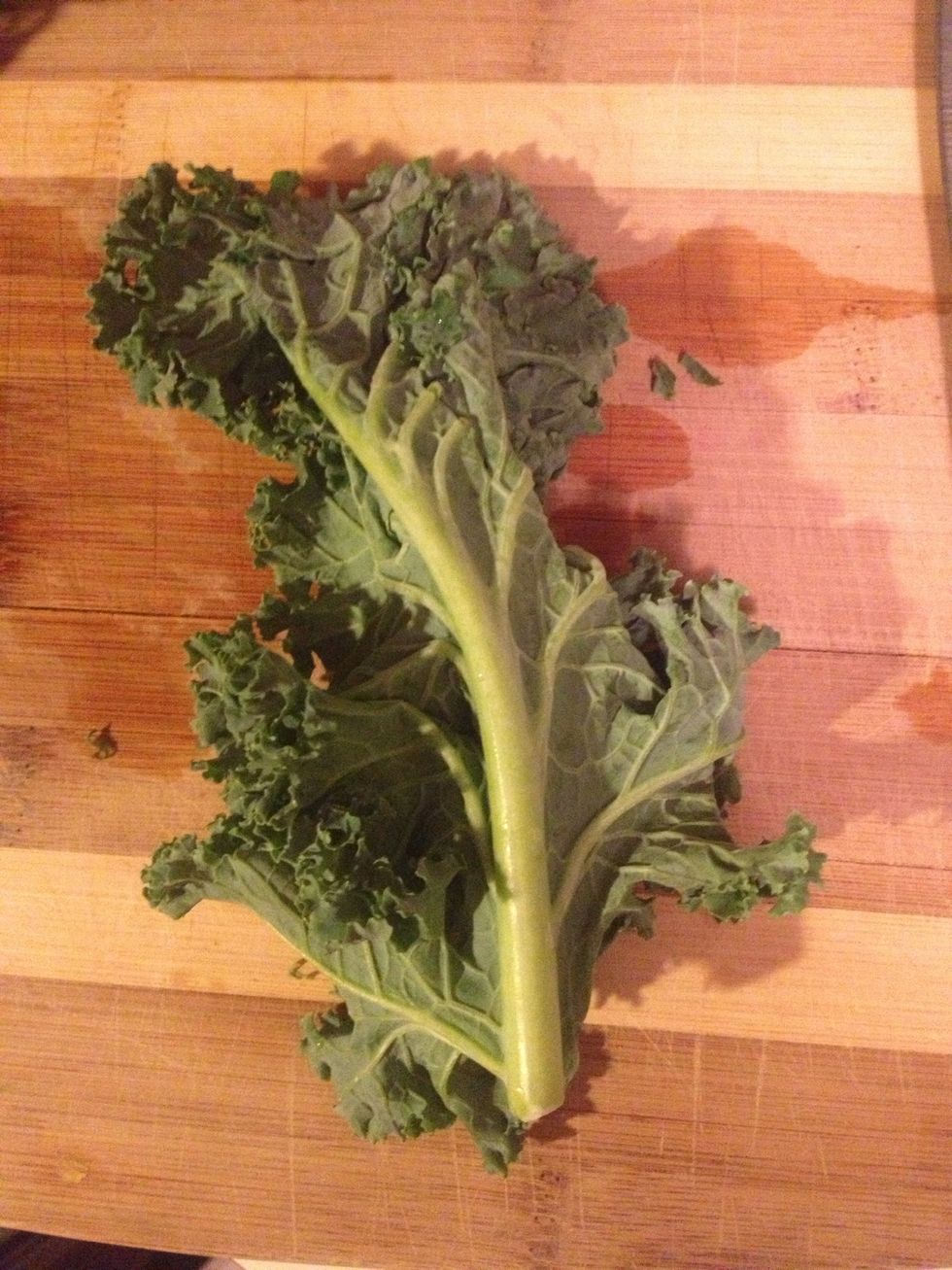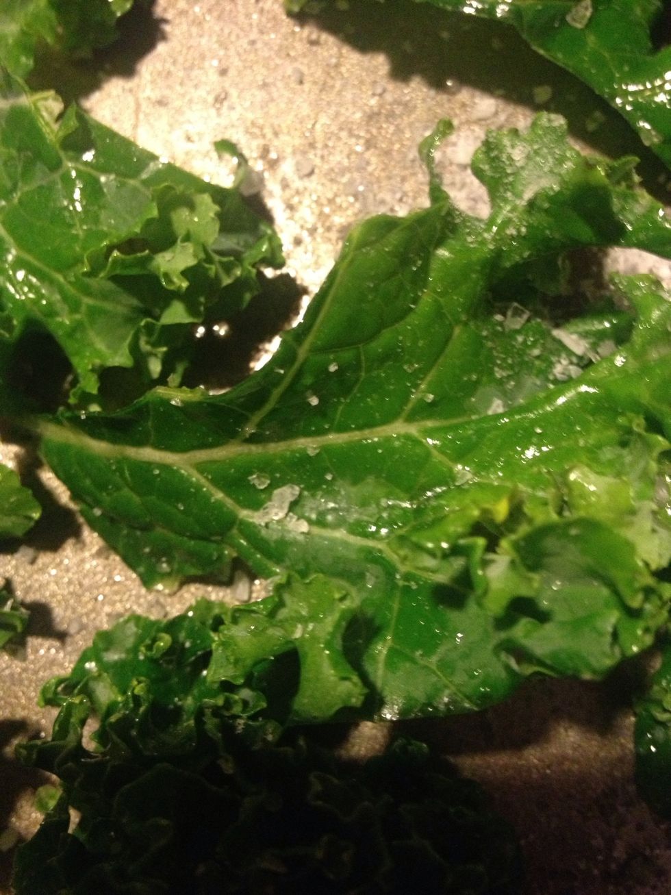 Wash and dry kale well. Then place on a baking sheet and add 1/2 to 1 tablespoon of olive oil (depending on amount of kale). Coat each piece evenly and spread out on the baking sheet.