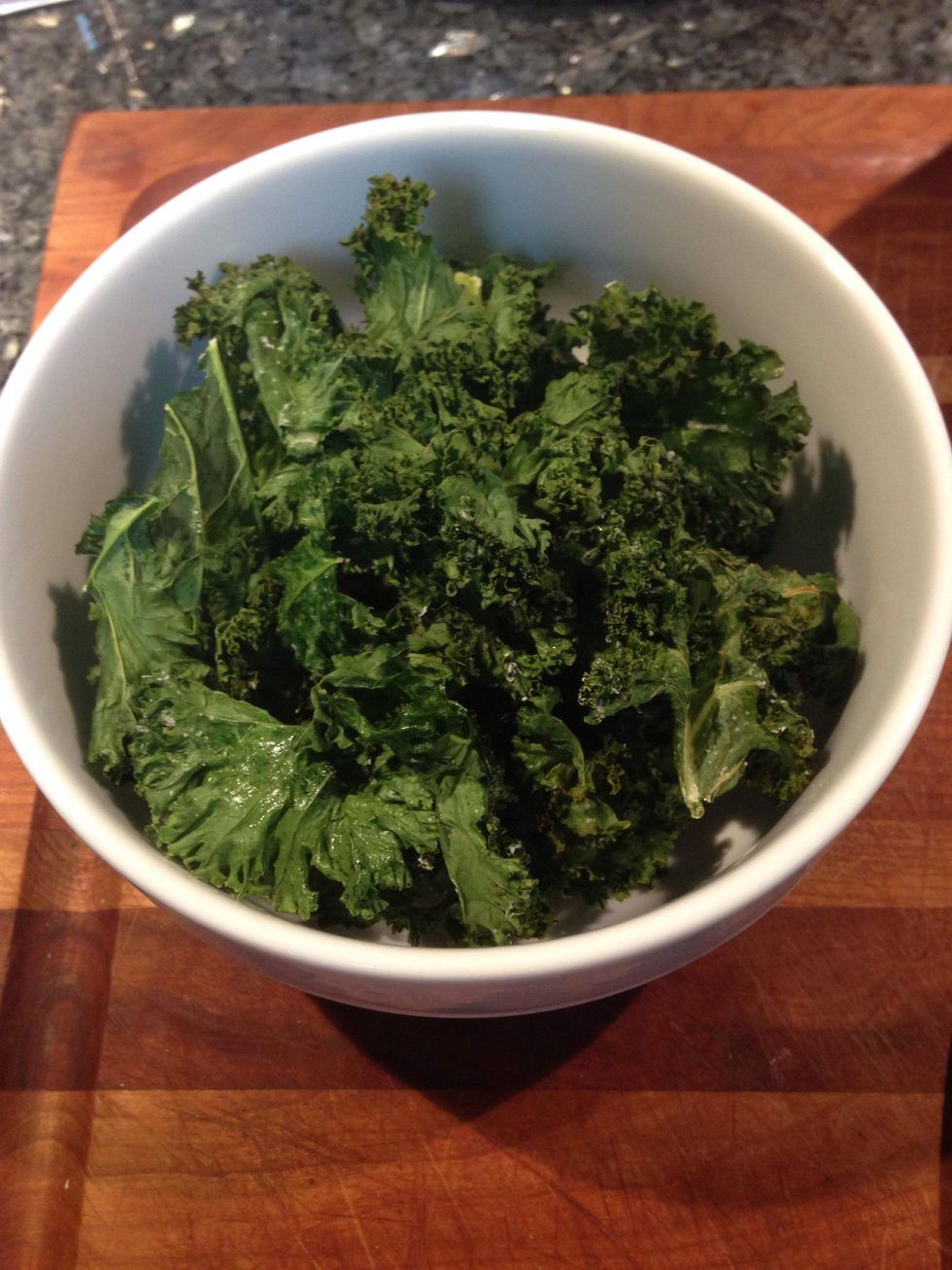 Wash and dry kale. Dry to make sure you get crispy chipsSpray or drizzle olive oilCuts stems and only put kale leaves on panAdd salt. Not too much.Put in 300 degree oven for 20 minutes. Check after 15 minutes.So delicious