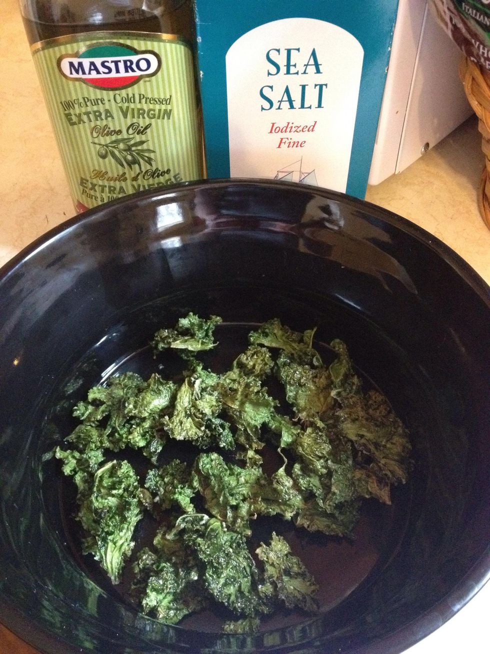 Tear Kale into bite sized pieces; rinse & dry well.Drizzle with olive oil.Mix well & add sea salt.Bake at 350' for about 10-12 minutes until slightly browned.
