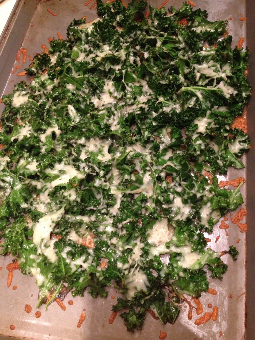 Put kale on cooking sheet and sprinkle Parmesan cheese on the top. Cook in oven at 300 degrees for 8-15 minutes or until the cheese is melted
