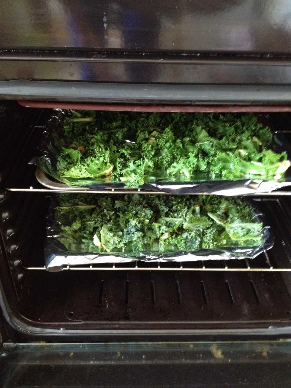 The end product doesn't look great, but should feel light and crispy like cooked seaweed. If some are still wet & limp, turn over leaves and put back in the oven.