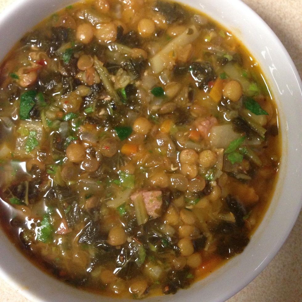Then add tomato pulp, broth, kale, lentils, salt, pepper, chili flakes, and basil leaves cover and let cook for about 25 mins. Add minced parsley and celery leaves once done.