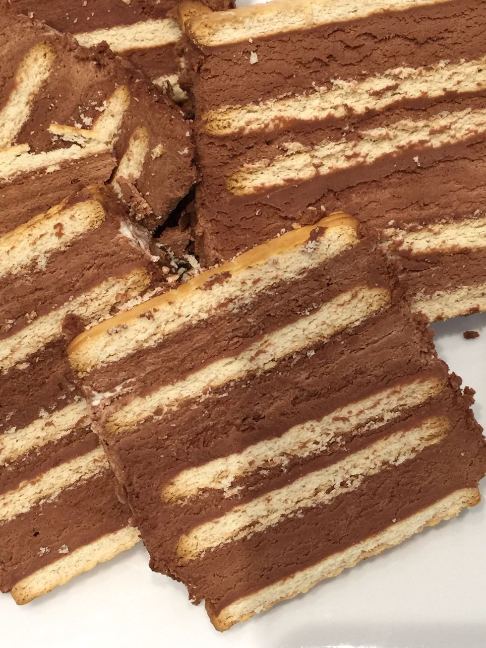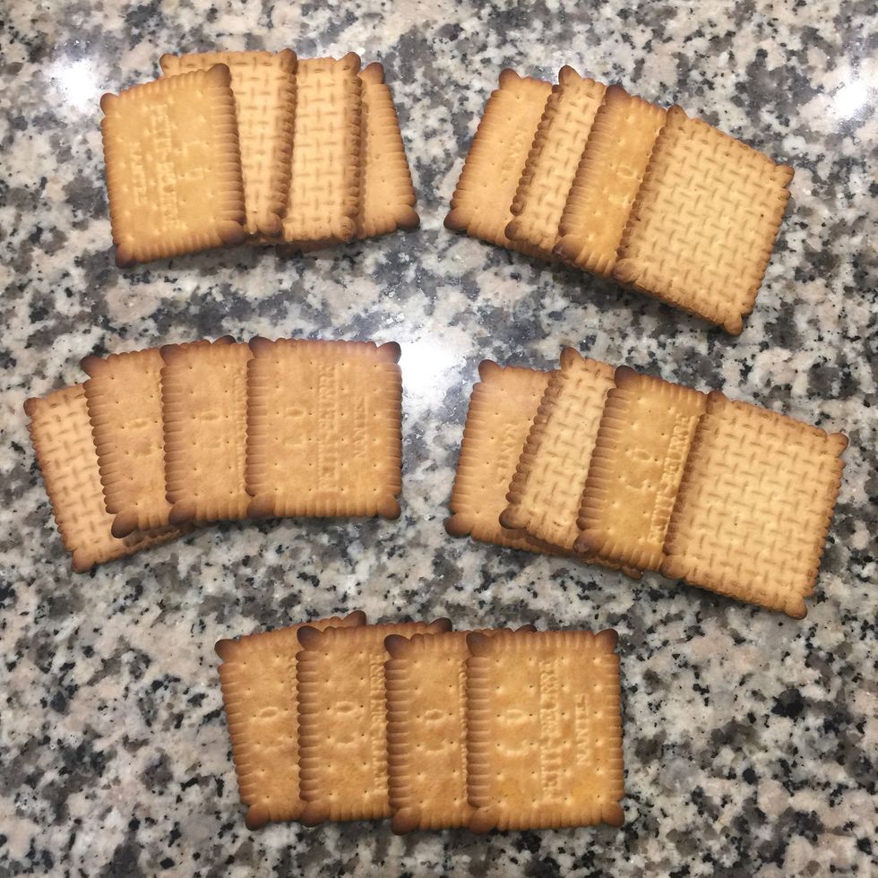 Start stacking the cake. 1st layer biscuits