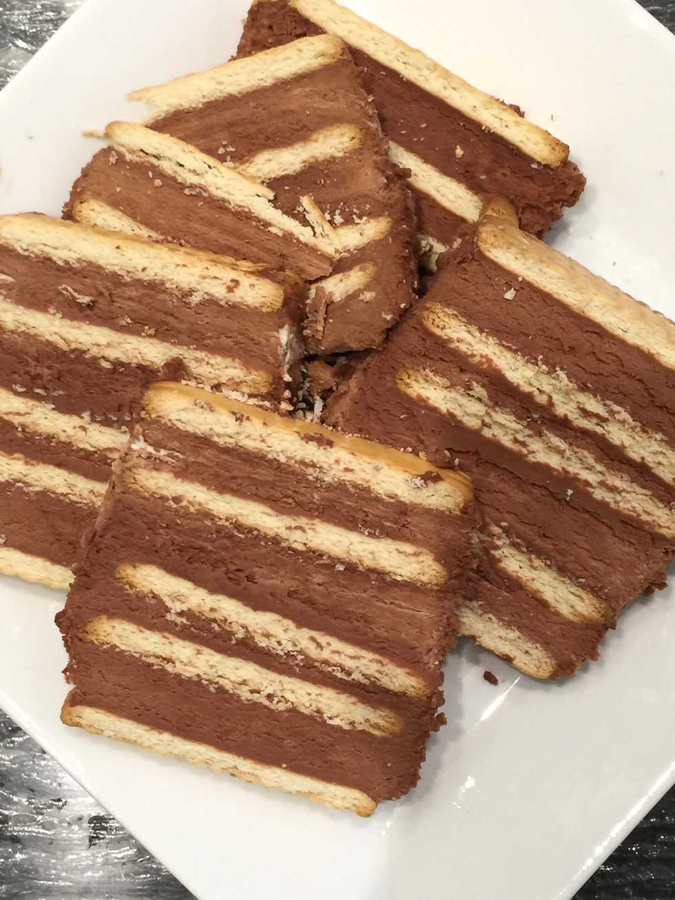 Add 1/4 of the chocolate mix and spread evenly. Then biscuit etc...