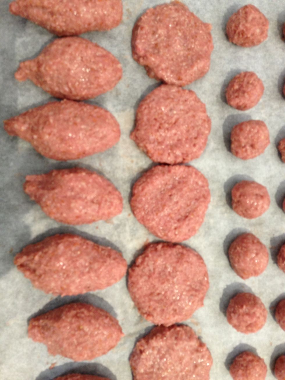 Forming the kibbeh paste. To the left is the traditional forms; empty elliptic form balls. I propose the other 2 forms. They need no special skill. Personally I prefer the small balls of 1 cm