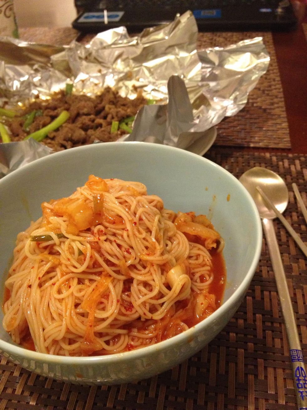 You might want another dish to go along incase the kimchi noodles are a bit spicy:) you can also add a boiled egg. They instantly help with the burning of spicyness!