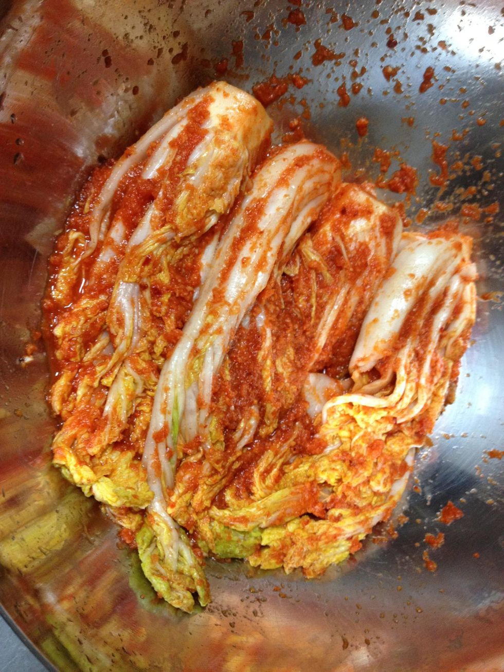 Put the purée in a big bowl and add a little bit sugar, salt, fish sauce, beef powder, chili powder and Korean hot pepper paste.