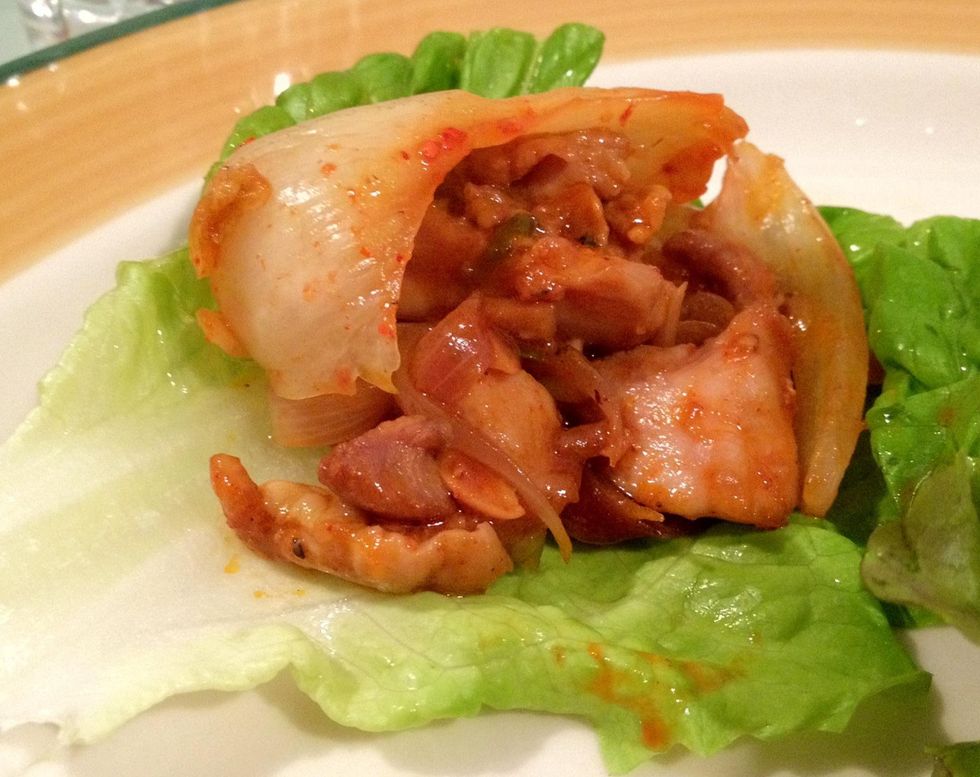 It's time to eat! Wrap some chicken in lettuce leave, add a piece of Kimchi if you have it. Yum! 😊