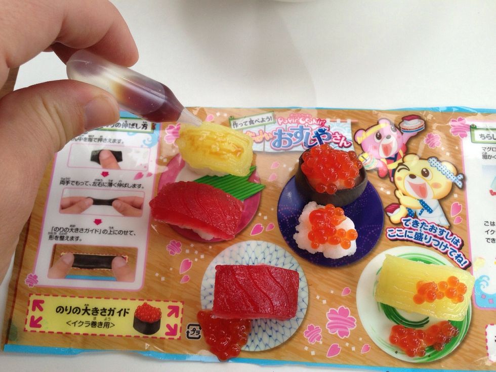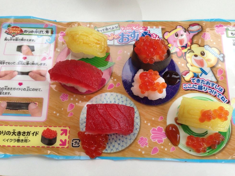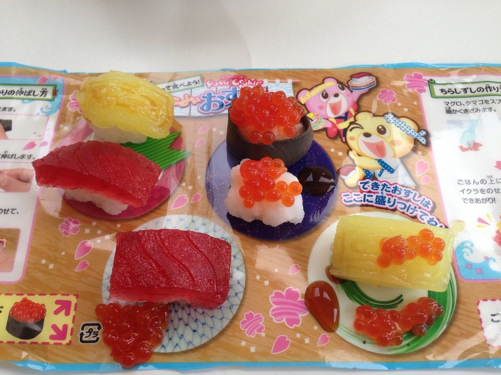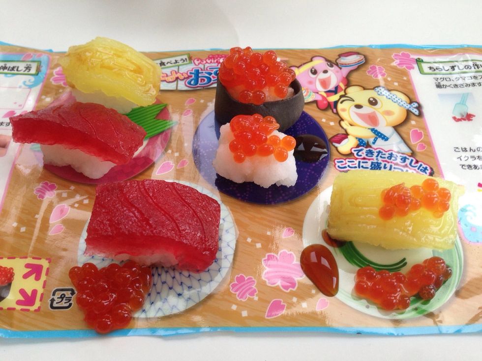 Mixing/Mold Tray, Spatula, Dropper-BLUE Rice Mix-GREEN Roe Bubble Activator-ORANGE Roe (Eggs)-YELLOW Tamago-BROWN Soy Sauce-PINK Tuna Sushi Mix-CLEAR Pack has the Nori which you Knead for Sushi Roll