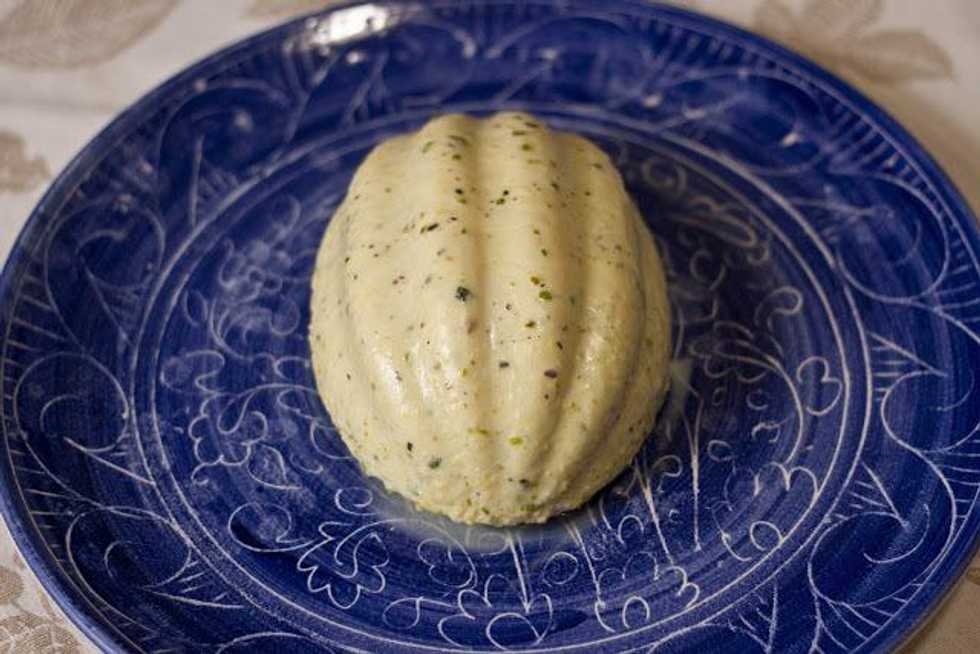 Mix everything well together and add in: 1/2 cup of finely ground pistachios. Remove the seeds from 5 green cardamom pods and grind them to a powder. Add it into the mix. Now mix in the mango puree.