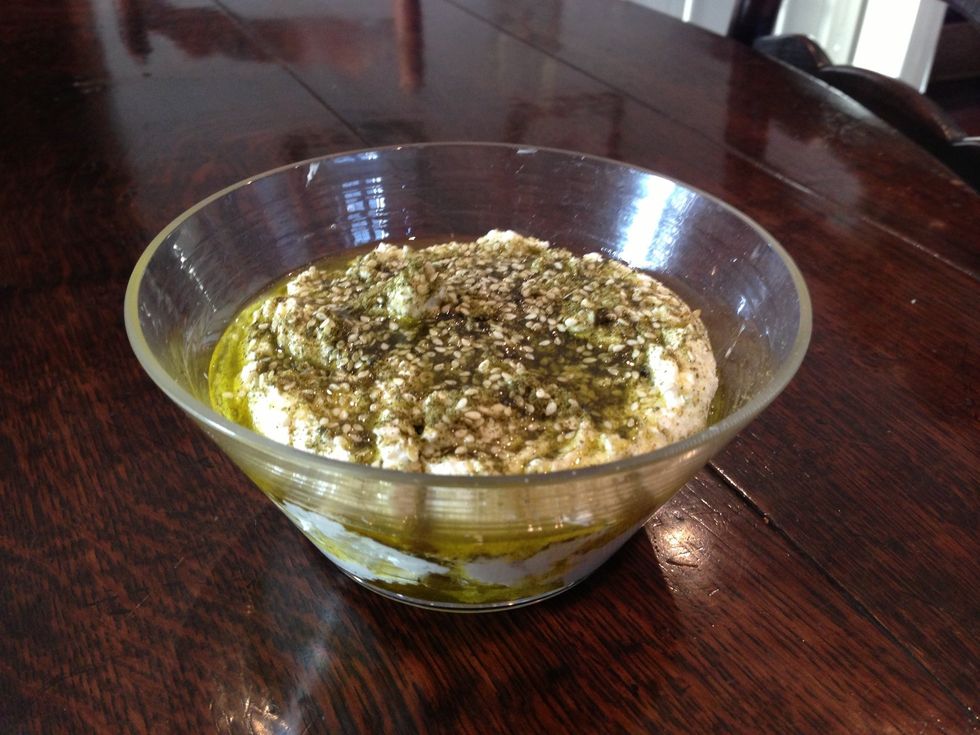 With a fork flatten down slightly the Labeneh and then sprinkle on Za'tar.