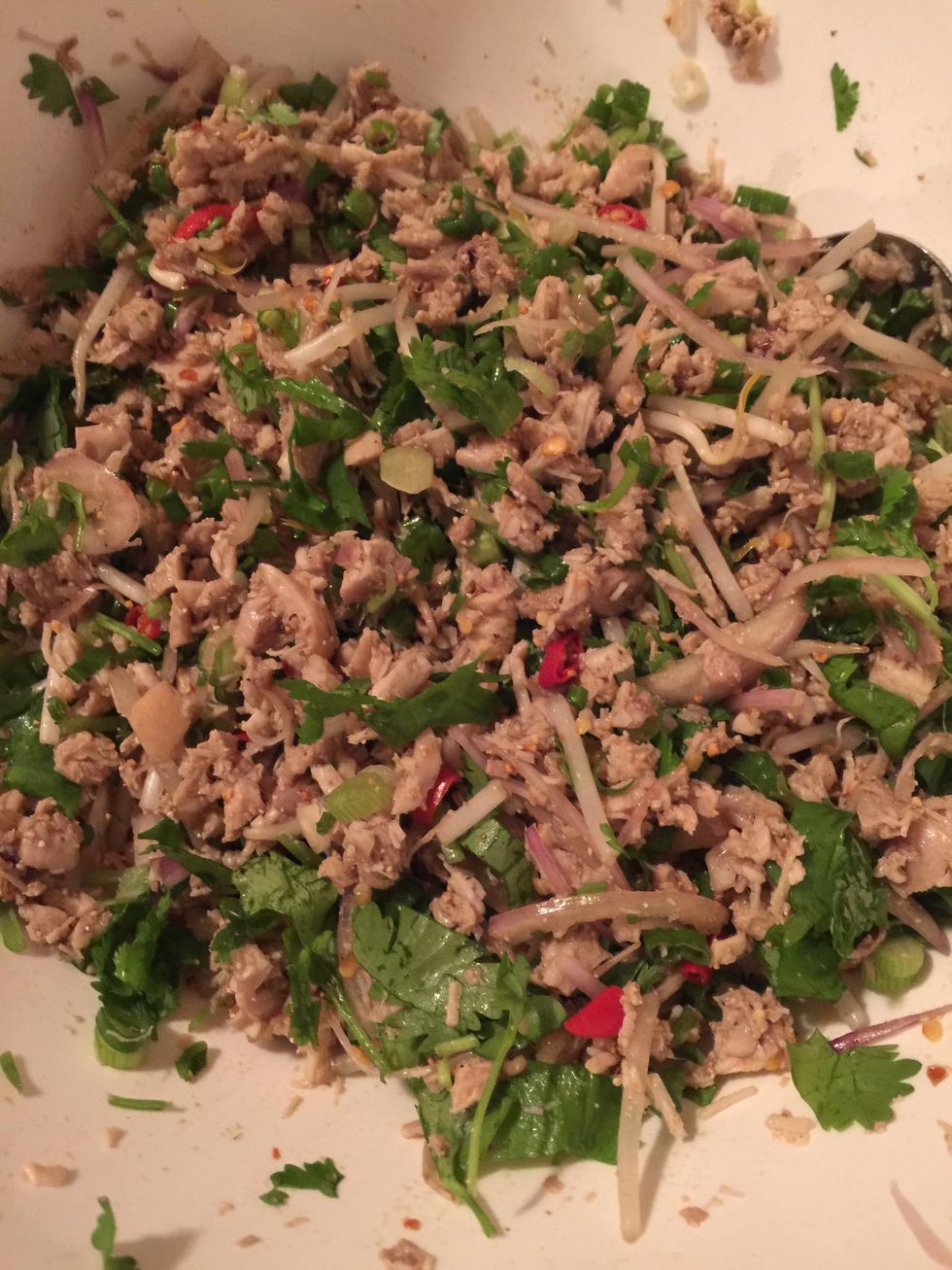 Loosely chop the chicken. Add to bowl with lime juices, fish sauce, red pepper flakes, chopped fresh/frozen chili peppers. Mix and add more of what you want until it tastes the way you like.