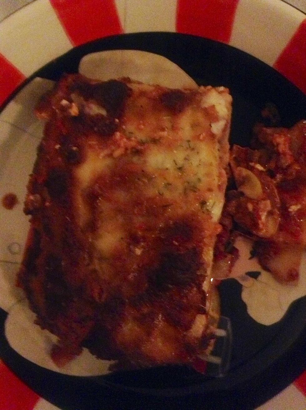 Here you go, 2 layers of lasagna pasta and 2 layers of veggies.. Surrounded by bolognaise sauce and goat cheese in the middle
