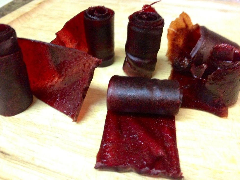 Once dried slice into strips and keep in the fridge. I like sour fruit Roll ups so I picked the fruit before fully ripened. You can add lemon juice after syrup has been reduced if not sour enough.