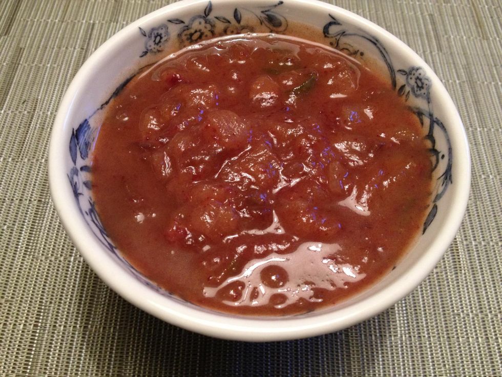 Bring to a boil over high heat. Lower heat and summer for an hour. Stir every once in a while. The chutney will thicken as it cooks.