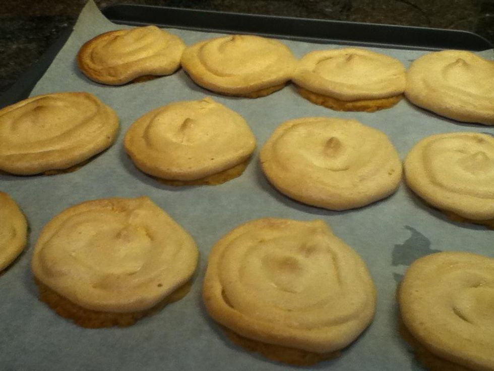 Snip your piping back about 0.5cm from the bottom and fill with the mirangue. Squeeze to the bottom and pipe onto the biscuits in rings! 💕