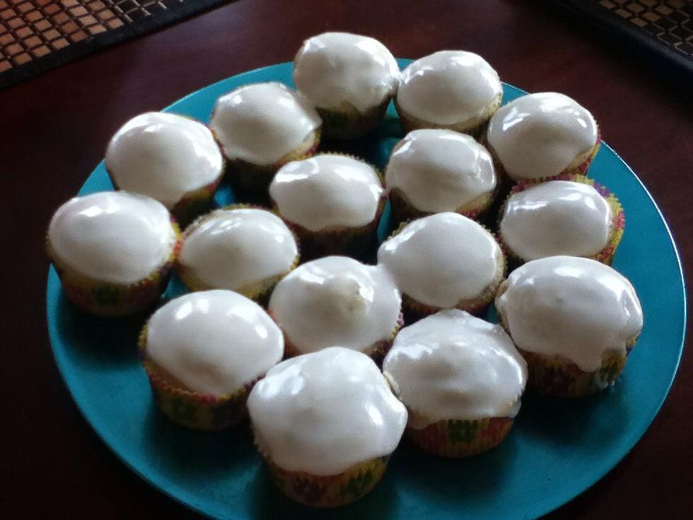 When cupcakes are totally cool, spread glaze on. It will continue to spread as it sits, so leave a little room on the edges.