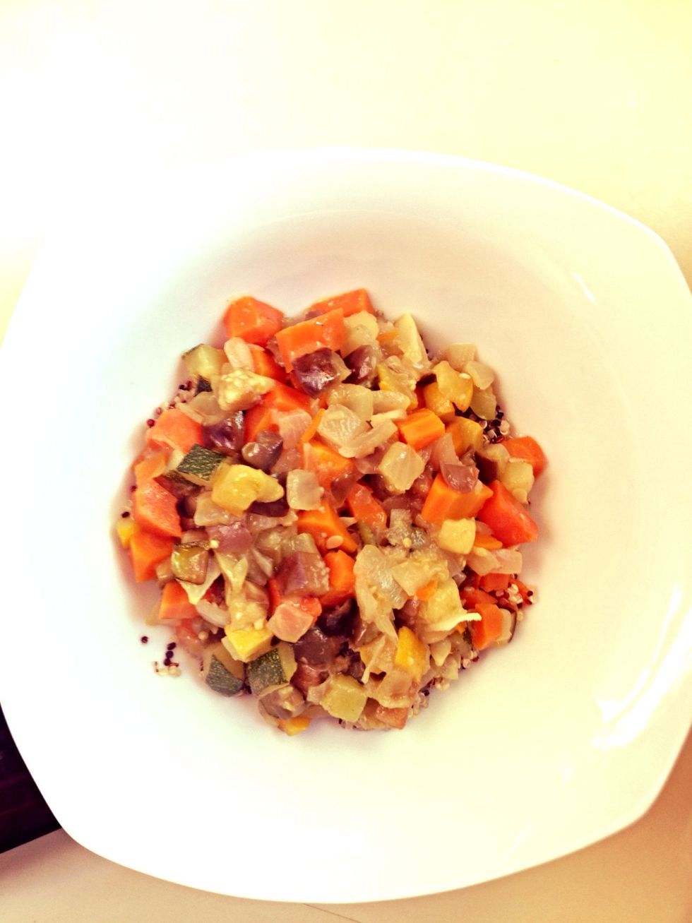 While the onion is cooking chop up the eggplant, squash, and carrots. Then add the veggies to the frying pan with the onion.