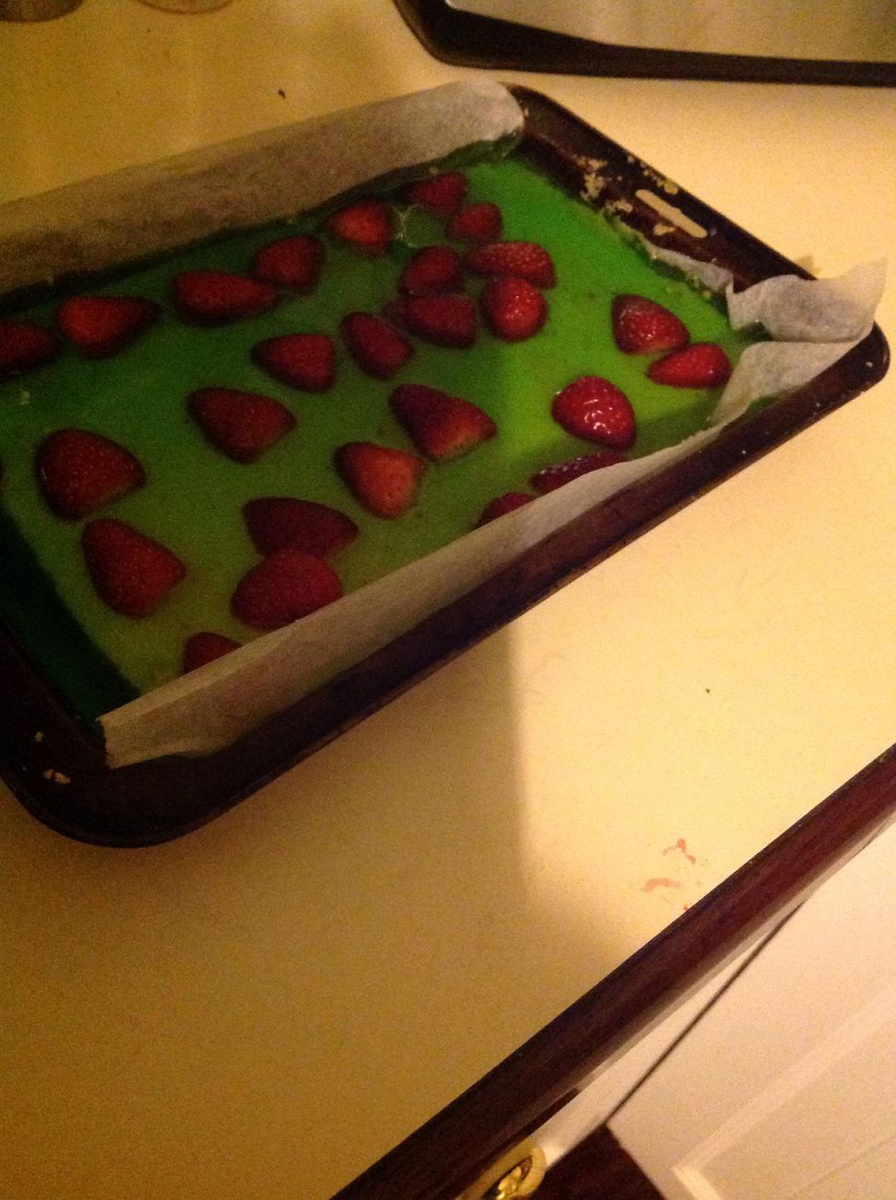 When the filling mix is set cute up some strawberries and neatly put them on the top of the set filling mix.