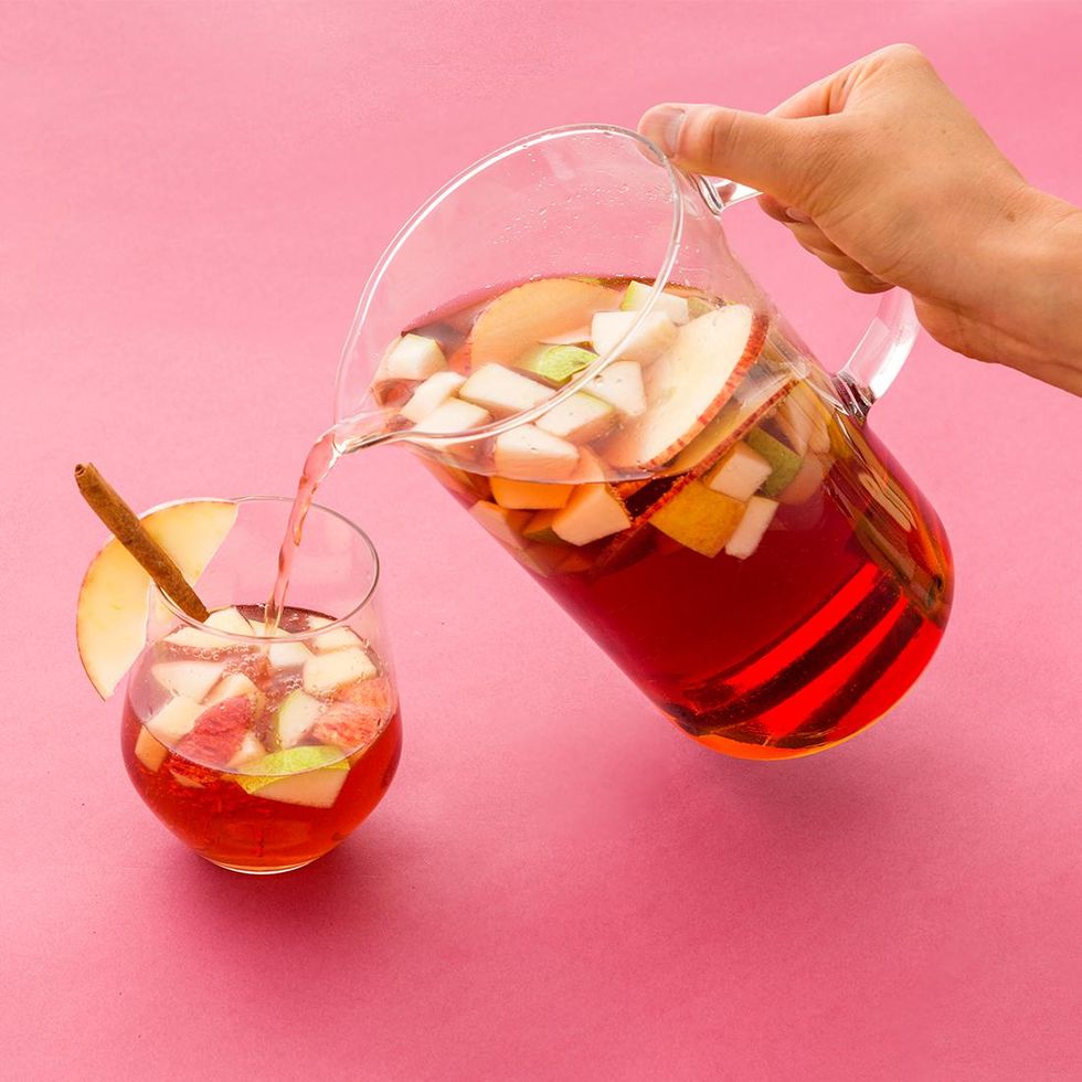 Add additional pieces of fruit to a glass and garnish with an apple slice and cinnamon stick. Pour and serve!