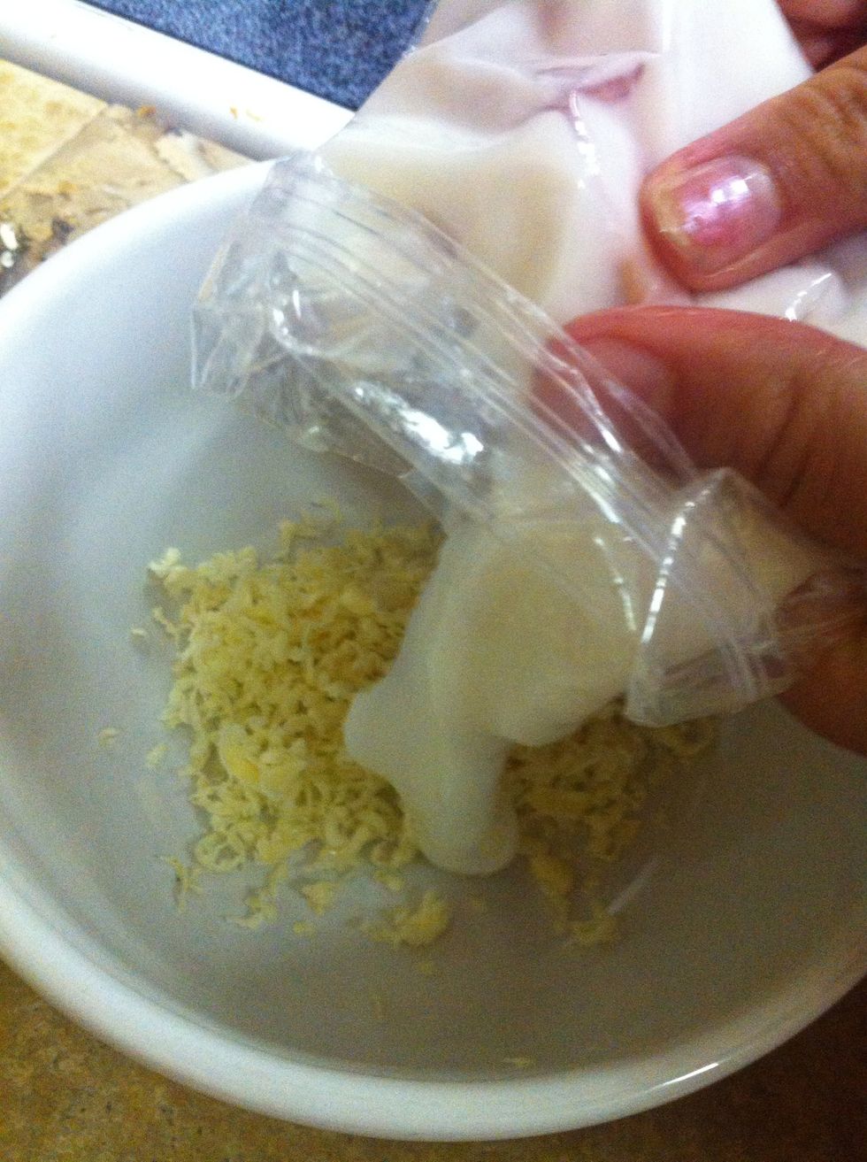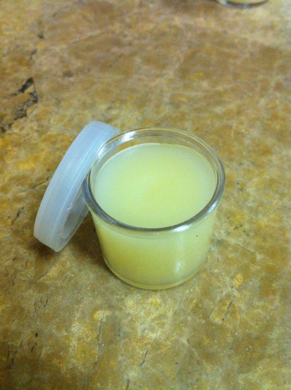 This!! Now test it on your lips....if you'd like it thicker, add some more grated beeswax and put it back in the microwave for 30 seconds.