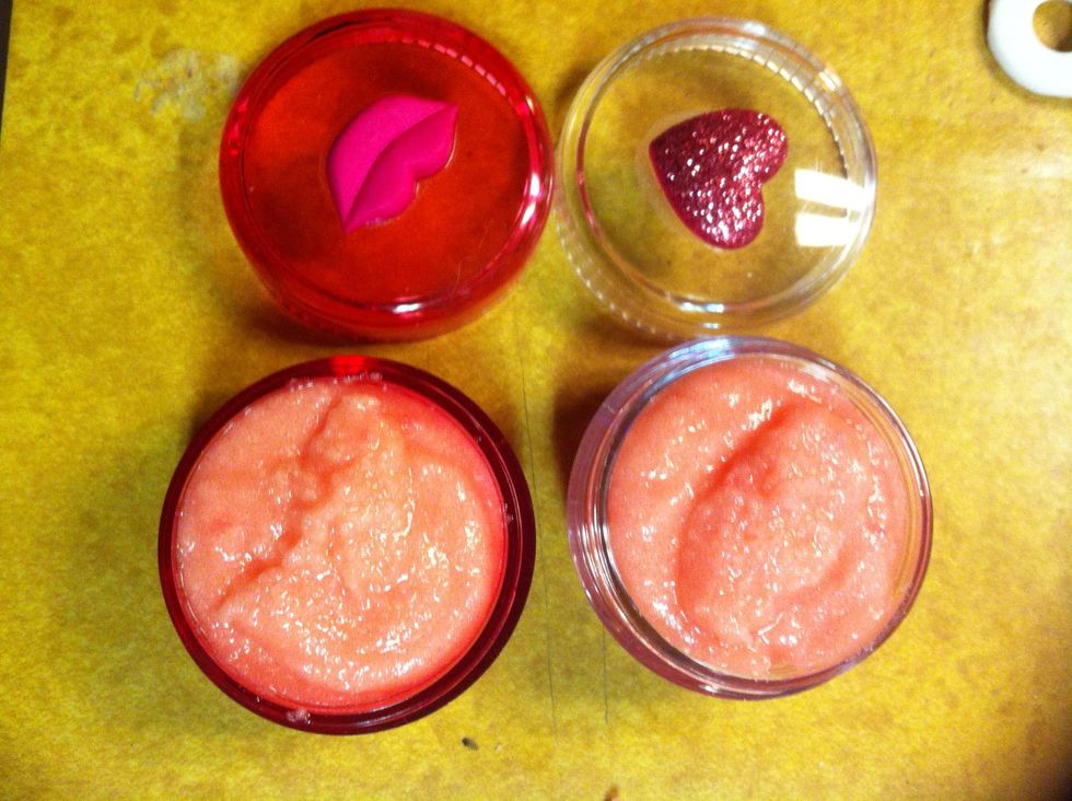 Viola ! Spoon gently into containers (makes two 1/2 oz jars) I super glued some lip charms from hobby lobby on the top lid for presentation sake