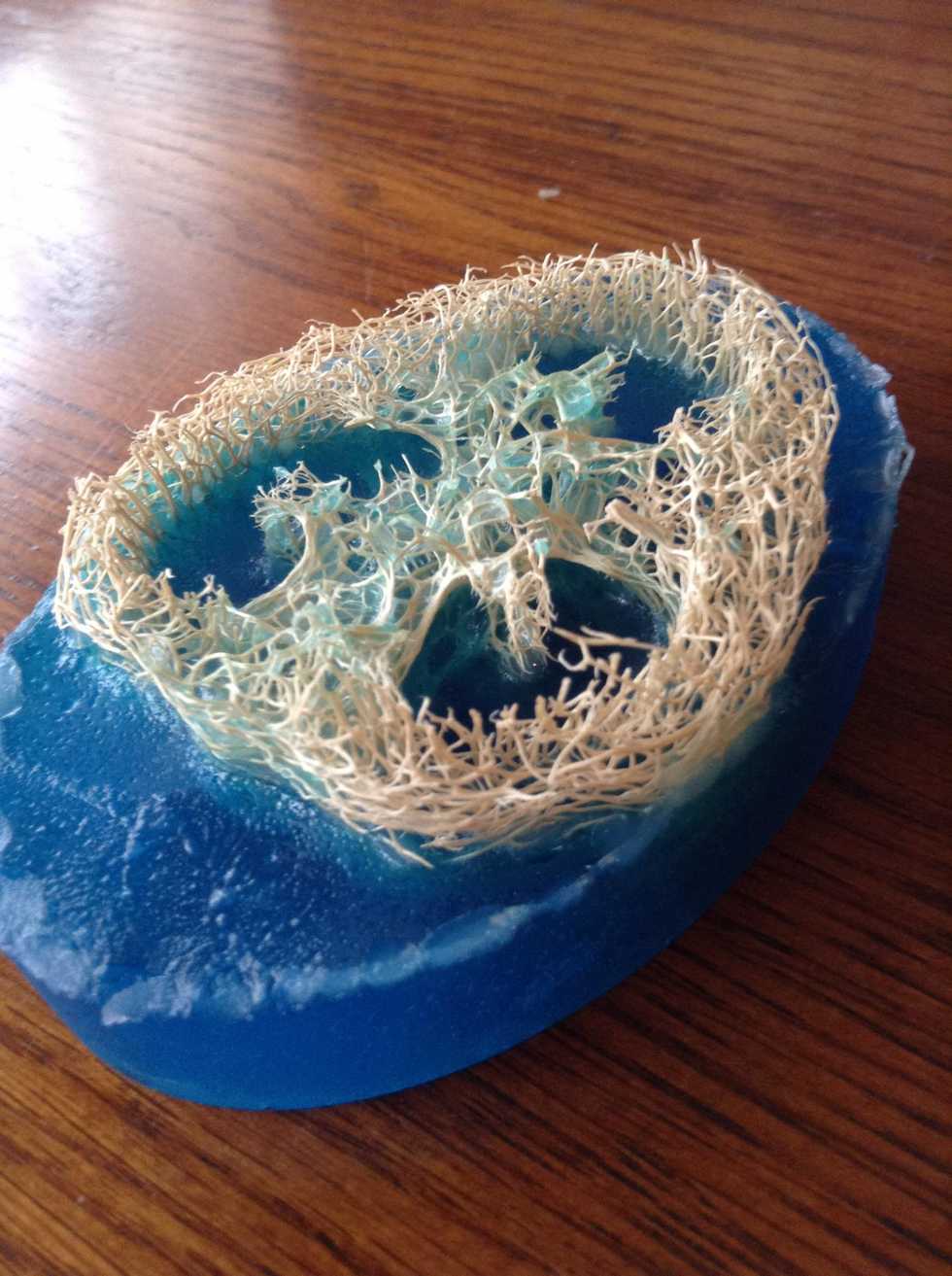 Finally, poor over the loofah in the mold and let it cool until hard. If your impatient like me, placing the soap in the fridge will speed up hardening time (about an hour).