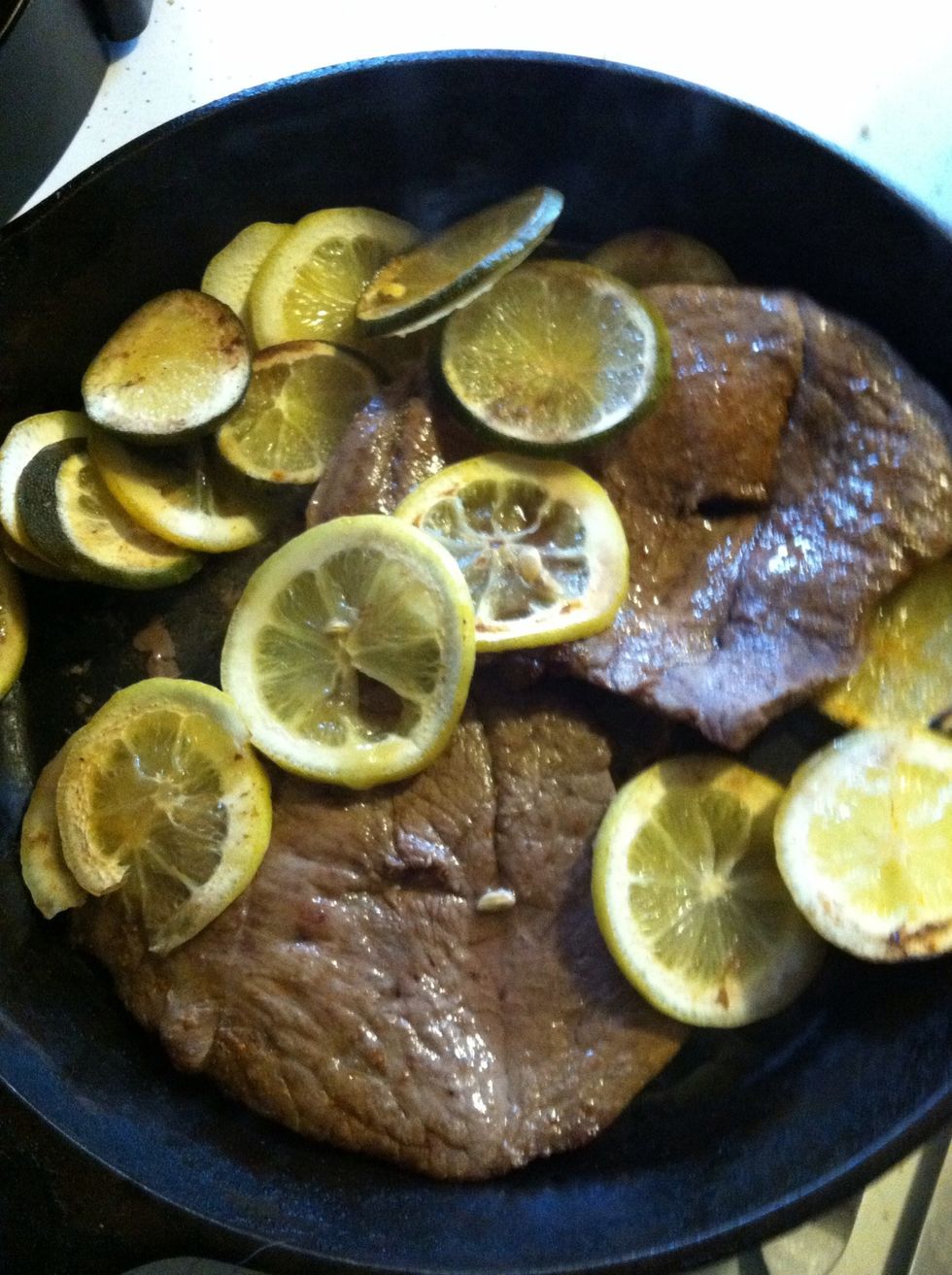 Add lemon and lime slices. Add steak, the season and flavor to your liking.